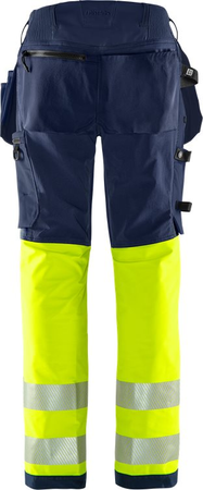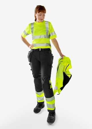 High Vis Handwerker Stretchhose für Damen, aus nachhaltigen 4-Wege Stretch-Materialien. Stretcheinsätze am Bund für herausragenden Komfort, sowie Verstärkungen an exponierten Stellen für zusätzliche Haltbarkeit. Mit EPD (Environmental Product Declaration). Teil der Fristads Green Kollektion / Nachhaltig / 4-Wege-Stretchmaterial / Rippenstrick-Stretcheinsätze am Bund / Strapazfähiges Ripstop 4-Wege Stretchmaterial an Gesäß und Oberschenkelrückseite / Verdeckter Knopf vorne / CORDURA®-verstärkte, lose hängende Vordertaschen, eine mit Reißverschlusstasche, 3 kleinen Taschen und Werkzeugschlaufen, die andere mit zusätzlicher Tasche / D-Ring unter der losen Tasche / 2 Vordertaschen / 2 große Taschen hinten, eine mit Reißverschluss / Beintasche mit Druckknopfverschluss, eine mit Reißverschluss / Doppelt verstärkte Schrittnaht / Hammerschlaufe / CORDURA®-verstärkte Zollstocktasche mit Werkzeugtasche, Stifttasche, Knöpfen und Schlaufen für Messer / Beintasche mit Druckknopfverschluss, Reißverschlusstasche und D-Ring / CORDURA®-verstärkte Knietaschen mit Innenöffnung / Höhenverstellung für Kniepolster in der Knietasche / CORDURA®-verstärkter Beinabschluss / Verdeckter Stiefelhaken / Zugelassen nach ISO 20471 Klasse 1, EN 14404 zusammen mit Kniepolstern 124292 und EN 13758-2 UPF 40+ Sonnen-UV-Schutz / Geprüft und zugelassen nach 50 Wäschen / Mit EPD (Environmental Product Declaration) - Registrierungsnummer 4489 bei environdec.com / Stretchgewebe 44% PTT (teilw. biobasiertes Material), 44% Polyester, 12% recycelter Polyester. Ripstop-Stretchgewebe 87 % Polyamid, 13 % Elastan.