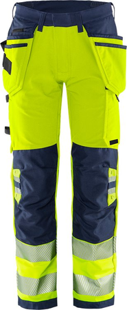 High Vis Handwerker Stretchhose aus nachhaltigen 4-Wege Stretch-Materialien. Stretcheinsätze am Bund für herausragenden Komfort, sowie Verstärkungen an exponierten Stellen für zusätzliche Haltbarkeit. Mit EPD (Environmental Product Declaration). Teil der Fristads Green Kollektion / Nachhaltig / 4-Wege-Stretchmaterial / Rippenstrick-Stretcheinsätze am Bund / Strapazfähiges Ripstop 4-Wege Stretchmaterial an Gesäß und Oberschenkelrückseite / Verdeckter Knopf vorne / CORDURA®-verstärkte, lose hängende Vordertaschen, eine mit Reißverschlusstasche, 3 kleinen Taschen und Werkzeugschlaufen, die andere mit zusätzlicher Tasche / D-Ring unter der losen Tasche / 2 Vordertaschen / 2 große Taschen hinten, eine mit Reißverschluss / Beintasche mit Druckknopfverschluss, eine mit Reißverschluss / Doppelt verstärkte Schrittnaht / Hammerschlaufe / CORDURA®-verstärkte Zollstocktasche mit Werkzeugtasche, Stifttasche, Knöpfen und Schlaufen für Messer / Beintasche mit Druckknopfverschluss, Reißverschlusstasche und D-Ring / CORDURA®-verstärkte Knietaschen mit Innenöffnung / Höhenverstellung für Kniepolster in der Knietasche / CORDURA®-verstärkter Beinabschluss / Verdeckter Stiefelhaken / Zugelassen nach ISO 20471 Klasse 2, EN 14404 zusammen mit Kniepolstern 124292 und EN 13758-2 UPF 40+ Sonnen-UV-Schutz. Farbe 271 ist zugelassen nach RIS-3279-TOM Ausgabe 1 UK Railway Standard / Geprüft und zugelassen nach 50 Wäschen / Mit EPD (Environmental Product Declaration) - Registrierungsnummer 3887 bei environdec.com / Stretchgewebe 44% PTT (teilw. biobasiertes Material), 44% Polyester, 12% recycelter Polyester. Ripstop-Stretchgewebe 87 % Polyamid, 13 % Elastan.