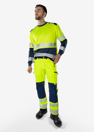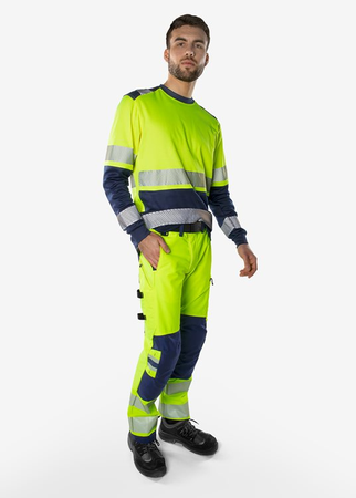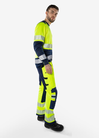 Nachhaltige High Vis Stretchhose mit zusätzlichen Stretcheinsätzen am Bund für überlegenen Komfort. Voller 4-Wege-Stretch aus recycelten Materialien sorgt für optimale Bewegungsfreiheit. Verstärkt an exponierten Stellen. Mit EPD (Environmental Product Declaration). Teil der Fristads Green Kollektion / Nachhaltig / 4-Wege-Stretchmaterial / Rippenstrick-Stretcheinsätze am Bund / Strapazfähiges Ripstop 4-Wege Stretchmaterial an Gesäß und Oberschenkelrückseite / Verdeckter Knopf vorne / D-Ring / 2 Vordertaschen / 2 große Taschen hinten, eine mit Reißverschluss / Beintasche mit Druckknopfverschluss, eine mit Reißverschluss / Doppelt verstärkte Schrittnaht / Hammerschlaufe / CORDURA®-verstärkte Zollstocktasche mit Werkzeugtasche, Stifttasche, Knöpfen und Schlaufen für Messer / Beintasche mit Druckknopfverschluss, Reißverschlusstasche und D-Ring / CORDURA®-verstärkte Knietaschen mit Innenöffnung / Höhenverstellung für Kniepolster in der Knietasche / CORDURA®-verstärkter Beinabschluss / Verdeckter Stiefelhaken / Zugelassen nach ISO 20471 Klasse 2, EN 14404 zusammen mit Kniepolstern 124292 und EN 13758-2 UPF 40+ Sonnen-UV-Schutz. Farbe 271 ist zugelassen nach RIS-3279-TOM Ausgabe 1 UK Railway Standard / Mit EPD (Environmental Product Declaration) - Registrierungsnummer 3888 bei environdec.com / Stretchgewebe 44% PTT (teilw. biobasiertes Material), 44% Polyester, 12% recycelter Polyester. Ripstop-Stretchgewebe 87 % Polyamid, 13 % Elastan.