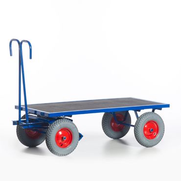 Deichsel mit Sicherheitshandgriff und automatischer gedämpfter Rückstellung in Ruheposition -- Räder ø 400 x 100 mm mit blaugrauer Luft-Bereifung mit Rollenlager und Stahlfelge, Blockprofil -- Profilstahlrahmen aus Winkelstahl -- Boden aus rutsch- und wetterfester Siebdruckplatte, bündig eingenietet -- Kugelgelagerter Lenkkranz, automatische Feststellbremse, auf die Vorderräder wirkend -- Pulverbeschichtung RAL 5010 enzianblau2000x10002200x1000