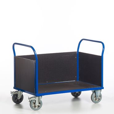 Stahlrohr ø 33,7 x 2 mm fest auf Grundrahmen geschweißt -- Lenkrollen ø 200 mm mit blaugraue Vollgummi-Schwerlast-Elastik-Bereifung - Kugellager und Gussfelge, Gehäuse verzinkt, Feststeller an den Lenkrollen gemäß Europäischer Norm EN 1757-3 -- Bockrollen (nicht drehbar) mit blaugraue Vollgummi-Schwerlast-Elastik-Bereifung - Kugellager und Gussfelge, Gehäuse verzinkt -- Ladefläche und Wände aus rutsch- und wetterfester Siebdruckplatte -- Profilstahlrahmen aus Winkelstahl und Quadratrohr -- Pulverbeschichtung RAL 5010 enzianblau2000x7802170x800