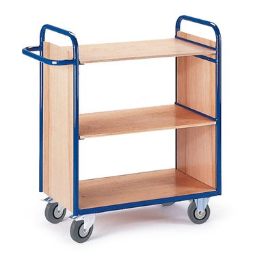 Stahlrohr ø 26,9 x 1,75 mm -- Lenkrollen ø 125 mm mit blaugrauer TPE-Bereifung - Rillenkugellager, Gehäuse verzinkt, Feststeller an den Lenkrollen gemäß Europäischer Norm EN 1757-3 -- Bockrollen ø 125 mm (nicht drehbar) mit blaugrauer TPE-Bereifung - Rillenkugellager, Gehäuse verzinkt -- Ladefläche aus Holzwerkstoffplatte (MDF) mit Buchedekor. Wände aus Holzwerkstoffplatte mit Buchedekor -- Rahmen aus Winkelstahl 30/30/3 mm -- Pulverbeschichtung RAL 5010 enzianblau - Etagenböden fest eingenietet1000x5001180x500