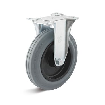 Bockrolle -- TPE-Rolle: Radkörper aus hochwertigem Kunststoff (PP) mit Kugellager -- Lauffläche aus TPE-Lauffläche, blaugrau, nicht kreidend -- ca. 85° Shore A -- Gehäuse: Standard Stahlblech, verzinkt -- Tragfähigkeit: 205 kg -- Bauhöhe: 235 mm