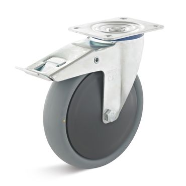 Lenkrolle mit Doppelstopp --TPE-Rolle: Radkörper aus elektrisch leitfähigem Kunststoff mit Kugellager -- Lauffläche aus TPE-ESD Bandage, blaugrau, nicht kreidend -- ca. 85° Shore A -- Gehäuse: Standard Stahlblech, verzinkt -- Gabelkopf mit zweichacher Kugellagerung -- Tragfähigkeit: 220 kg -- Bauhöhe: 235 mm -- Feststeller gemäß Europäischer Norm EN 1757-3