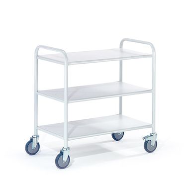 Stahlkonstruktion aus Stahlrohr -- 4 x Lenkrollen ø 125 mm mit blaugrauer TPE-Bereifung und Rollenlager und Kunststofffelge, Gehäuse verzinkt, 2 Lenkrollen mit Feststeller gemäß Europäischer Norm EN 1757-3 -- Ladeflächen aus Holzwerkstoffplatte (MDF) mit weißem Dekor. -- Pulverbeschichtung RAL 7035 lichtgrau -- zusätzlich Querstreben unter der Holzböden für höchste Stabilität -- Etagen sind fest zwischen den Seitenteilen verschweißt, dadurch höste Stabilität beim Fahren schwerer Akten780x500880x590