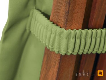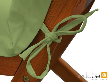 Umlaufend befindet sich ein optisch ansprechender Stehsaum. Für den optimalen Sitz der Auflage sorgt ein elastisches Halteband am Rückenteil und zwei Bindekordeln im Lehnenknick. Damit lässt sich diese Auflage an allen Niederlehner Stühlen befestigen.